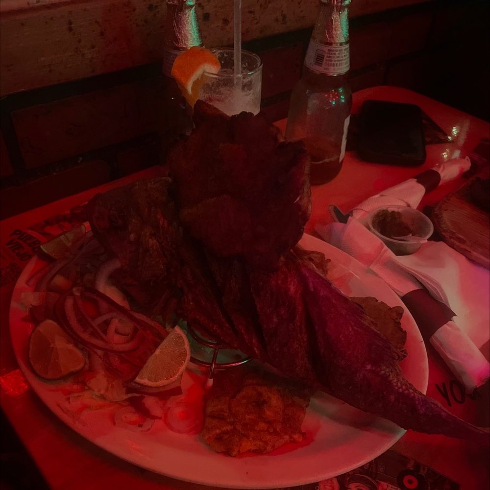 (whole red snapper fried, lettuce, tomatoes & fried green plantains)